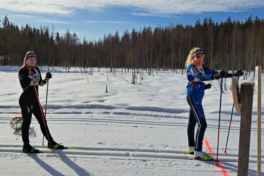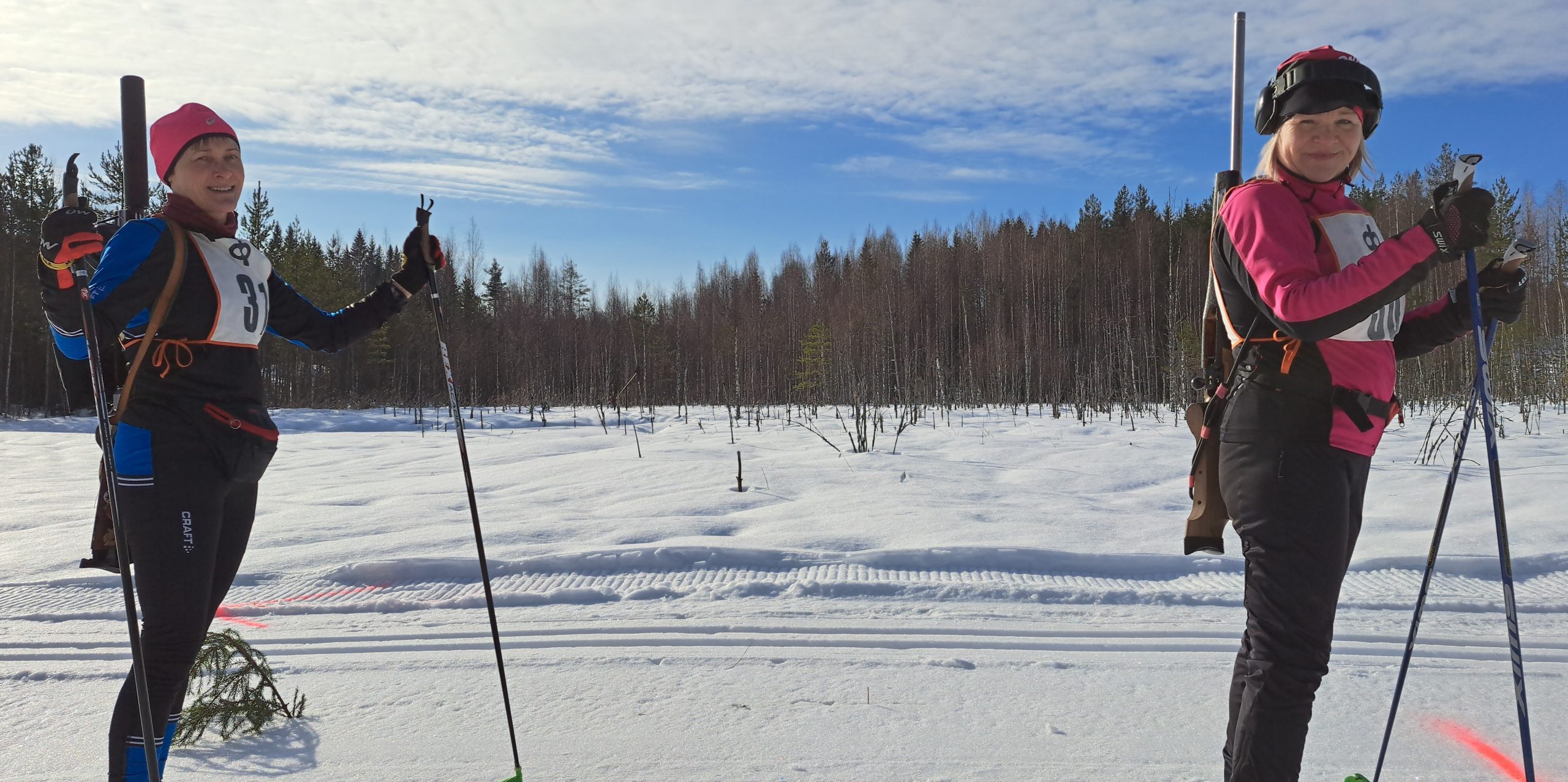 Vasemmalla hirvenhiihdon naisten sarjan Pohjois-Karjalan piirinmestari Pirjo Nevalainen ja oikealla hirvenhiihtelyn naisten sarjan P-K:n piirinmestari Tarja Tiainen. Avoimet piirinmestaruuskisat keräsivät 40 osallistujaa.